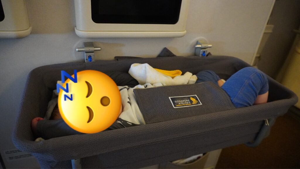 16:25 発の便では、子ども座席の予約の際にバシネット(ベビーベッド)席を案内していただけました。子どもが途中で寝てくれたため、夜到着でもそこまで負担はありませんでした。